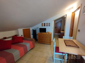 Trattasi di appartamentino mansardato facente parte di un immobile composto da p.t. e appunto, mansarda, composto da ingresso, soggiorno-cucinotto, camera da letto, wc con vasca/doccia e ampia terrazza dotata di gazebo coperto arredato e con vista mare mozzafiato. La camera da letto dispone di letto matrimoniale mentre nel soggiorno vi è un ampio divano letto. Dotata di aria condizionata. Si accede tramite cancello e giardino esclusivi. Dispone di parcheggio esclusivo e di doccia esterna riscaldata
