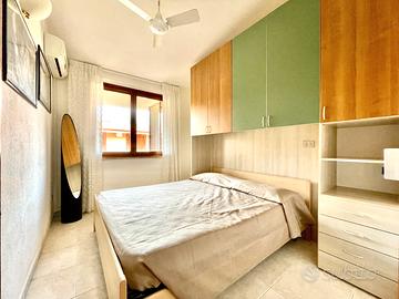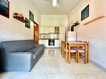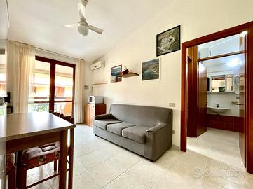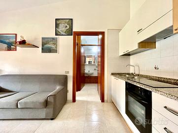Internamente l'immobile è composto da un pranzo-soggiorno luminoso, climatizzato, e arredato di parete cottura e comodo divano. Alla sinistra della zona giorno, un disimpegno ci conduce alla camera da letto matrimoniale e al bagno completo di doccia.