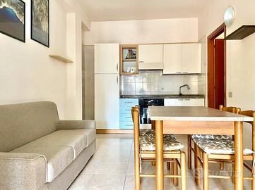 Varcata la soglia d'ingresso, si viene accolti da una cucina-pranzo di forma regolare dotata di parete cottura, divano e tavolo da pranzo.