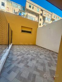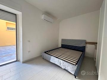 L'appartamento di 40mq, sito al piano terra, si compone di un'ampio e luminoso soggiorno con angolo cottura, un bagno fornito da nuovi servizi e doccia spaziosa ed, infine, una camera da letto matrimoniale con accesso diretto al cortile privato di 21 mq.