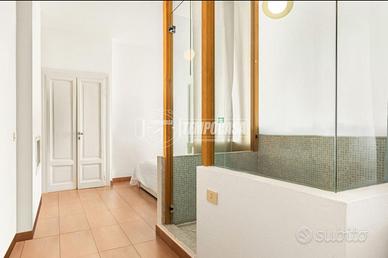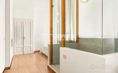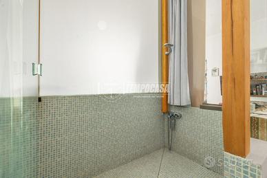 Ed è proprio qui che si inserisce un autentico elemento di design e benessere: una DOCCIA WALK-IN IN CRISTALLO, impreziosita da un elegante mosaico Bisazza, A VISTA tra la zona giorno e la zona notte. Una scelta stilistica audace e sofisticata, che trasforma un gesto quotidiano in un'esperienza wellness, integrandosi perfettamente con l'estetica contemporanea dell'appartamento.