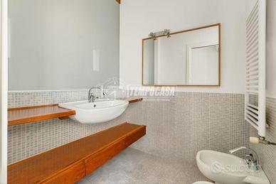Il bagno, finestrato, completa la zona con sanitari sospesi e scalda salviette, in perfetta armonia con il mosaico.