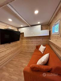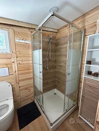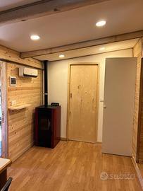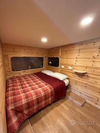 illuminazione a soffitto con faretti led da cartongesso, soffitti in cartongesso, stufa a pellet più condizionatore e scaldino, box doccia 90x90 rinvestito con piastrelle in gres porcellanato. Tutto super isolato e insonorizzato, Infissi in Pvc, fogna collegata. Nessun tubo a vista. 6 posti letto, cucina a gas, frigorifero. Non manca nulla, è davvero come un appartamento, posso dire che è una bomboniera. Vendo per inutilizzo!