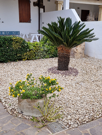 Elegante villino a schiera con giardino in località Sottotorre a Calasetta, a 700 metri dalle due spiagge di "Sottotorre" e "Le Saline", a 700 metri dalla via Roma e dalla piazza Belly (via e piazza principali del centro turistico) e ad 1 km dal porto turistico, raggiungibili a piedi in pochi minuti.