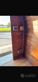 Casa 6 metri per tre , compresa di impianto elettrico e scarico, qualora si volesse aggiungere un bagno, rivestita con parquet laminato all'interno e legno di faggio per le pareti all'esterno misto tra rame e alluminio totalmente coibentata può tranquillamente stare all'aperto prezzo poco trattabile. Tolgo per mancanza di spazio.
