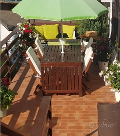 Piano rialzato: terrazzo esterno raggiungibile tramite scale, ingresso sulla zona giorno con angolo cottura, soggiorno spazioso e scala a chiocciola per il piano superiore.