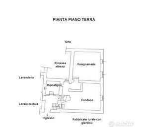 -dietro la porta alla destra dell'ingresso,a seguito di una piccola rampa discale,vi sono un fondaco vuoto e un locale adibito a falegnameria, dotata di ciminiera.Il tetto della falegnameria è in legno e pur avendo le travi in buono stato di conservazione, è formato da alcune tavole da risistemare.