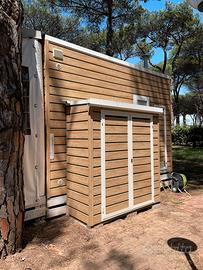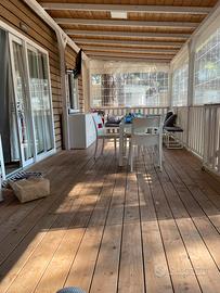 Casa mobile arredata nel villaggio Malva del campeggio Parco della Gallinara Anzio. Tre camere, due bagni, cucina completa con lavastoviglie, armadio esterno con lavatrice, impianto tv, aria condizionata con pompa di calore.