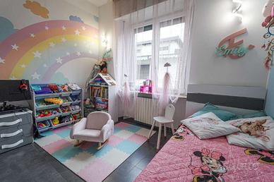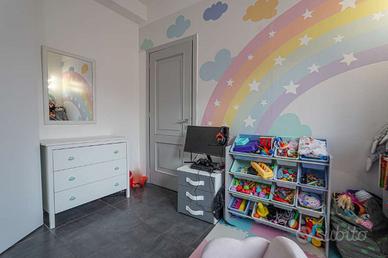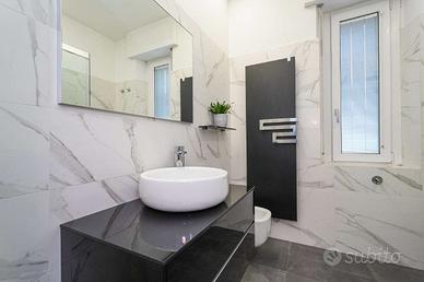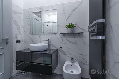 Un piccolo disimpegno conduce alla zona notte, composta da un bagno finestrato con ampio piatto doccia e sanitari sospesi, e da due camere, di cui una matrimoniale di generose dimensioni.