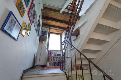 All'interno, l'abitazione si sviluppa su più livelli. Al piano terra troviamo una graziosa veranda arredata come un intimo salottino, che funge anche da isolante termico nei mesi invernali. Proseguendo, la zona giorno è luminosa, esposta a sud-ovest (come la maggior parte dei locali) , ed è dotata di cucina con piano a induzione.