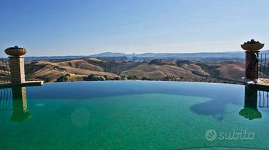 Al casale si accede tramite un viale di cipressi con due cancelli elettrici tra colonne in pietra coronate da statue in marmo. La casa sorge in posizione dominante, circondata da ampie terrazze, larghi pergolati e portici, da splendidi giardini (in parte pianeggianti e in parte terrazzati) e di fronte al casale si trova una zona relax con con piscina a sfioro e vasca idromassaggio con vista panoramica.