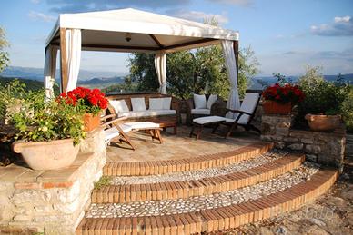 Il casale è circondato da circa un ettaro di terreno completamento recintato diviso tra uliveto, un splendido giardino rigoglioso con un frutteto e vari terrazzi e zone di relax. Scendendo alcuni gradini, in posizione panoramica, troviamo la piscina con solarium, un bellissimo gazebo sopraelevato, doccia e un locale con spogliatoio, wc, ripostiglio ed il locale tecnico. In adiacenza alla piscina c'è anche una zona con la predisposizione per una cucina esterna.