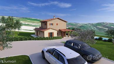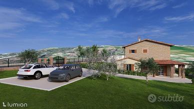 (Riferimento: TODI39-1-1-1) Nella campagna della zona residenziale di Fontignano si vende un casale panoramico in pietra di nuova costruzione su due livelli con vista Todi.