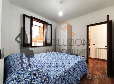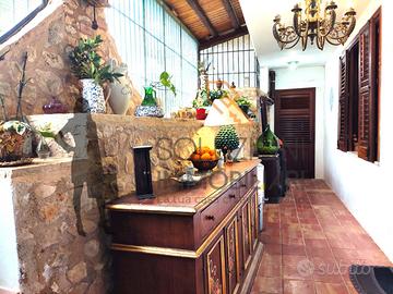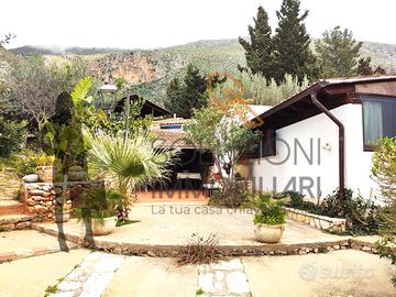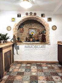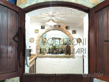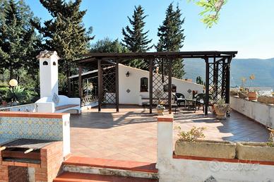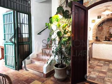 La porzione principale dell'immobile è composta da un comodissimo patio costituito da coppe siciliane e travi in legno dove possiamo notare i muretti in pietra a secco, soggiorno con cucina a vista in marmo e piano cottura ubicato all'interno di una nicchia finestrata rivestita in pietra, disimpegno, scala per l'accesso alle terrazze con vista panoramica, ampio soggiorno con camino, angolo cottura, comodo bagno con doccia e finestra, camera da letto con piccolo sottoscala e cameretta con ulteriore bagno con doccia e finestra.
