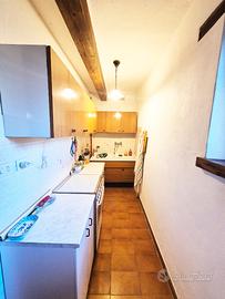 La prima porzione, interamente in pietra, ospita al piano primo un accogliente appartamento composto da soggiorno con camino e cucina a vista, due camere matrimoniali e un bagno. Al piano terra si trovano una spaziosa taverna con cucina e camino, oltre a un fondo utile come magazzino o spazio multifunzionale.
