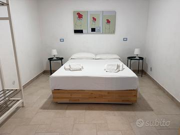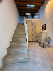 Mini appartamento soppalcato composto da zona living con cucina, bagno completo con doccia e camera da letto sul soppalco con tetto tipico in canne e gesso.