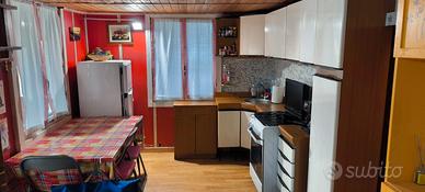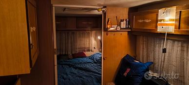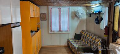 Casetta in legno completamente arredata comprensiva di elettrodomestici nuovi a cui e' annessa roulotte per zona notte, con bagno chimico. Veranda e piccolo giardino laterale. Dispone anche di condizionatore portatile.