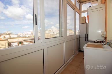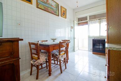 Ci accoglie un ingresso collegato alla sala/soggiorno molto luminosa e di buone dimensioni con due accessi uno dei quali di fronte alla cucina.; la stessa , abitabile e di buone dimensioni, è dotata di ampia finestra e porta finestra con serrande elettriche e uscita ad un balcone chiuso con vetrate ed adibito a zona lavanderia.
