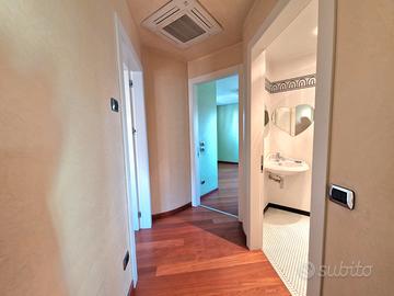 La zona giorno, ampia e luminosa, si sviluppa in un open space che invita alla convivialità e al relax, mentre il terrazzino regala una vista spettacolare sulla piazza sottostante, trasformando ogni momento trascorso all'esterno in un'esperienza unica. La camera matrimoniale, elegante e sofisticata, è il rifugio perfetto per il riposo, arricchita dalla luce naturale che penetra attraverso le ampie finestre.