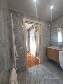 Tre bagni privati moderni con rivestimenti effetto marmo e sanitari sospesi
