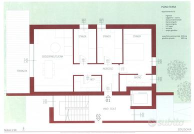 L'appartamento è posto a piano terra, è libero su tre lati ed è circondato da un ampio giardino (380 mq). Si compone di ingresso, luminoso soggiorno-cucina con affaccio sul giardino, disimpegno notte, tre stanze da letto, doppi servizi, di cui uno finestrato.