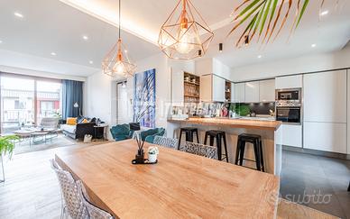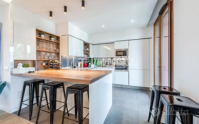 Si compone di ingresso su ampia zona giorno con una splendida cucina a vista che affaccia sul terrazzo di c.a. 20 mq mentre la zona living è composta dall'area pranzo ed il ripostiglio e affaccia sul balcone di 11 mq interno cortile.