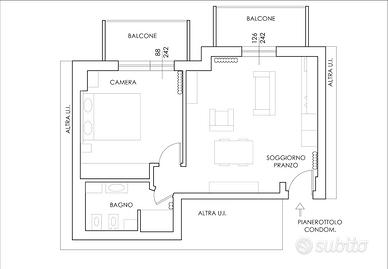 L'appartamento è composto da una zona giorno con cucina e soggiorno in ambiente unico, luminosa e funzionale, con accesso diretto al terrazzo. La zona notte è ampia e molto luminosa, con letto matrimoniale e arredi complementari.