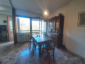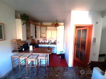 ingresso living con angolo cottura a vista, bagno di servizio, balcone, vista ad Ovest, ampio terrazzo PANORAMICO al piano inferiore a mezzo di scala interna si accede alla zona notte costituita da: due camere, bagno, ripostiglio. Completano la proprietà: soffitta e posto auto esclusivo in locale Autorimessa open-space.