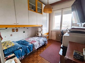 L'immobile in oggetto risulta posizionato in una zona periferica rispetto al centro cittadino di Trieste. Defilato dalle arterie di traffico e totalmente isolato dai rumori del traffico. Servizio di trasporto pubblico con linea dei bus 20 - 40 - 47 a 100 metri con destinazione città e Muggia. L'appartamento sito al terzo piano dispone di una doppia esposizione, una a nord e una a est, di un'ottima luminosità e di una gradevole veduta aperta e panoramica sulla Valle Rosandra e sul colle di Altura - Cattinara. L'edificio è stato costruito nel 1970. Palazzina che si sviluppa su tre piani residenziali e costituita da 12 enti abitativi. Dotata di ascensore e sistema di riscaldamento centralizzato con caldaia installata nel 2009. Parti comuni con totale recupero conservativo eseguito nel 2020/2021 con rifacimento delle facciate con isolamento termico a capotto. Portone e vano scale ben tenuti. Il complesso residenziale dispone sotto casa di un'area privata dedicata al parcheggio veicolare libero, ma non assegnato. La zona comunque non ha nessun problema di parcheggio sulla via di accesso. Gli interni si presentano in condizioni generali modeste con finiture e impianti che risalgono al 1986. I serramenti sono originali, doppi in legno con classiche tapparelle oscuranti. Pavimentazione di atrio e cucina con ceramiche anni 80 e le tre stanze sono con pavimentazione in legno con listelli di parquet originali. Impiantistica tutta relativa agli anni 80 con bagno rifatto anch'esso nel 1986. Porte interne originali e portoncino d'ingresso blindato. Impianto di climatizzazione . Il riscaldamento centralizzato con caldaia a gas metano è dotato anche di acqua calda e fredda centralizzata. Piano: 3° e ultimo con ascensore Composizione: atrio, soggiorno e cucina semi abitabile entrambi con accesso al terrazzo, disimpegno, stanza, stanzetta, bagno Mq interni: 65,00 calpestabili + 4,00 di terrazzo ( 2,30 x 1,50 mt ) Incarico in esclusiva