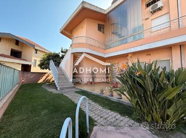 Vendiamo nella via Lisbona a Selargius, in bel contesto riservato e silenzioso di sole ville, ampio appartamento quadrivano (come fosse una villa), con giardino privato e taverna, posto al piano terra di una grande villa composta da sole due unità abitative. Attraverso uno spazio esterno privato si accede all'appartamento composto al suo interno da ingresso su disimpegno, ampio e luminosissimo soggiorno, 3 camere, cucina abitabile, due bagni, balconi, ampio giardino privato e ampia taverna con camino e bagno. Nella vendita sono inclusi due garage e altri ampi spazi al piano seminterrato.