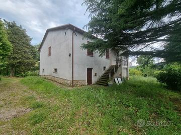 Complesso immobiliare composto da: - Casa singola di complessivi mq 250 con ampio soggiorno con camino, cucina abitabile, quattro camere matrimoniali, bagno, ripostiglio e terrazzo a paino primo oltre a fondi e cantina a piano terra. - Ex essiccatoio di mq 240 e due tettoie di complessivi mq 200 adiacente la casa. Completa la proprietà 10 ettari di terreno circostante la proprietà. Possibilità di vendita frazionata. Rif. VT/230 Ape ''G'' Per info su questo immobile Agenzia Cortesi Trestina