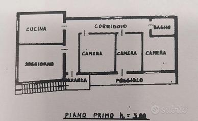 Secondo piano, appartamento accessibile tramite scala esterna, costituito da cucina, soggiorno, tre camere, bagno, superficie complessiva 128 mq. Riscaldamento caldaia a metano. Veranda più poggiolo completano il primo piano.