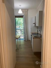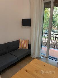 Bilocale 45 mq arredato e ristrutturato a nuovo . Soggiorno con cucina a vista,camera con letto matrimoniale( +letto singolo aggiuntivo su richiesta),bagno finestrato e balcone con affaccio tranquillo su verde condominiale. Stabile con custode e portineria,giardino condominiale e comodo parcheggio fronte casa gratuito.