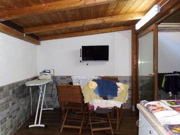 proprietà splendidamente curata. Entrando, l'appartamento ospita sulla sinistra un versatile e accogliente soggiorno mentre a destra troviamo la cucina con l'accesso al terrazzo. La disposizione degli spazi favorisce un ambiente conviviale per cucinare e pranzare, con grandi porte a vetro che si aprono fra le varie stanze e sul terrazzo, accentuando ulteriormente la sensazione di spaziosità e ariosità degli ambienti. Il terrazzo di 60 mq offre un tranquillo rifugio che si estende per circa 10 m di lunghezza. Questo spazio esterno ben curato vanta un ampio patio con una cucina attrezzata con tavola e sedie oltre ad una lavanderia, offrendo l'ambiente perfetto per pranzare all'aperto o semplicemente godersi la tranquillità circostante, ideale per rilassarsi o intrattenere gli ospiti.