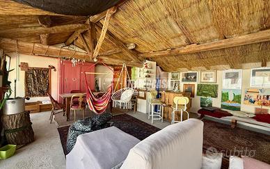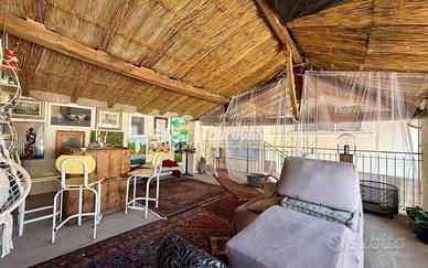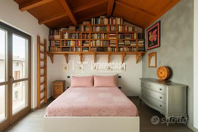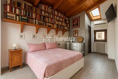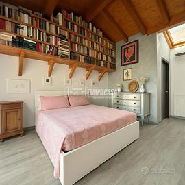 Salendo al primo piano troviamo una spaziosa camera da letto, davvero suggestiva, con una libreria a soppalco sopra il letto, una cabina armadio e accesso a un terrazzino privato che dona aria e luce all'ambiente. Completano il piano un antibagno e un bagno finestrato elegante e curato nei dettagli.
