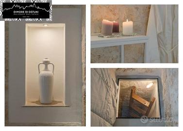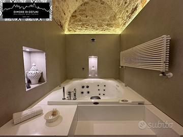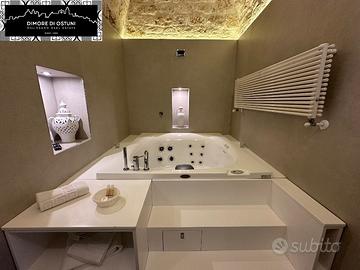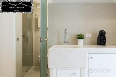 A seguire una romantica zona notte incastonata nell'accogliente alcova in cui è distribuito il letto matrimoniale ed a seguire un bagno "en-suite" servito di cabina doccia, pronta ad accogliere migliaia di viaggiatori italiani e stranieri che non vedranno l'ora di soggiornare in questo gioiello nel cuore di Ostuni.