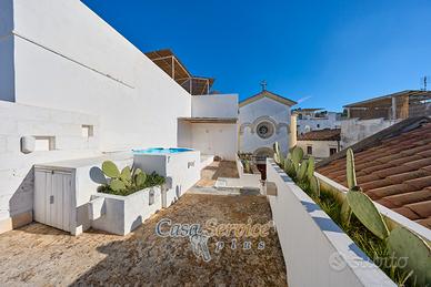 All'esterno, troviamo una grande terrazza solarium con una piscina mediterranea, una splendida zona ombra con sedute ed una doccia esterna. Durante le giornate più calde, potrai rinfrescarti nella piccola piscina affacciata sulla chiesa settecentesca. Le comode sedute e i morbidi cuscini invitano a godersi una cena al tramonto o sotto le stelle.