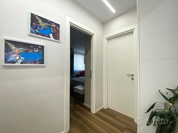Appartamento di 130 mq con raffinata zona living, cucina con penisola, suite matrimoniale con bagno privato, due camere, bagno principale e ripostiglio.