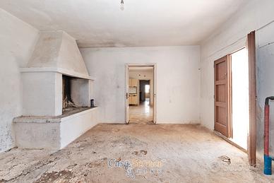 Il piano terra è composto da ingresso, attraverso cui, con scala interna coperta, accedere in una suggestiva cantina voltata a botte, altro vano con bagno, cucina con camino e uscita sull'esterno e ulteriore vano ad uso deposito/legnaia con ulteriore antico camino (il cosiddetto "focalire") sempre con uscita sull'esterno.