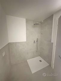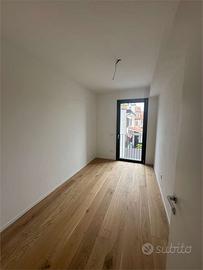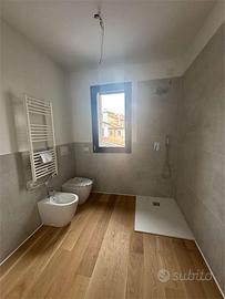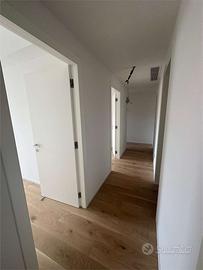 Materiali di qualità superiore e finiture curate nei minimi dettagli, soglie in marmo nero assoluto, pavimenti in listoni di legno, ceramiche nei bagni