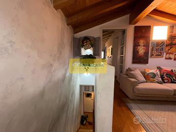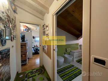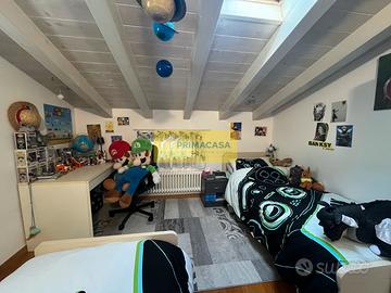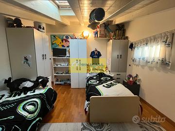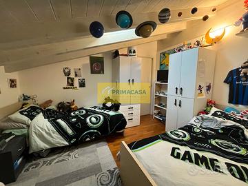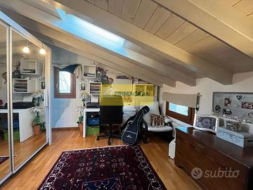 Al piano superiore, un ampio sottotetto ospita la camera matrimoniale con uno studio annesso. A questo livello troviamo anche una saletta, un ripostiglio e una cameretta con bagno privato, ideale per i più giovani o per gli ospiti.