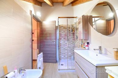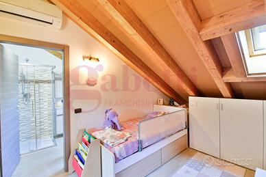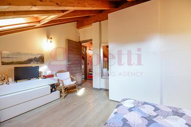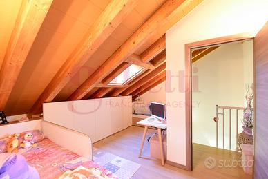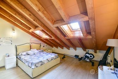 L'immobile è composto da ingresso su ampio e luminoso soggiorno con cucina semi-abitabile ed affaccio su terrazzo di 15 mq (esposizione sud-ovest), disimpegno che conduce alle due camere da letto ed al bagno completo di vasca. Tramite una comoda scala si accede al piano superiore rifinito con travi in legno dove troviamo una spaziosa camera matrimoniale, illuminata da due aperture velux, il secondo bagno provvisto di box doccia e un terzo ambiente utilizzato ad oggi come cameretta.