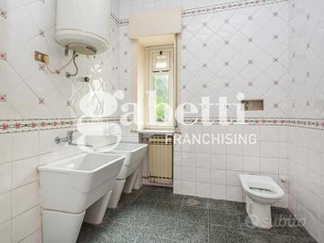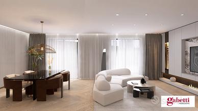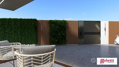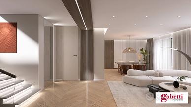 La zona notte, posta al primo piano, offre quattro camere da letto ben distribuite, tra cui una con bagno privato e un'ampia cabina armadio, oltre a un secondo bagno e tre balconate terrazzate che donano luce, aria e una splendida continuità tra spazi interni ed esterni. La proprietà include un box auto di circa 17 mq, un posto auto condominiale interno e un generoso spazio esterno di circa 185 mq che amplifica ulteriormente il piacere abitativo.