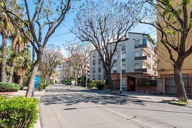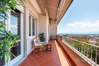 La zona giorno, accogliente e luminosa, si apre su una splendida veranda panoramica che domina il Golfo di Cagliari. Una moderna scala in ferro e legno conduce al soppalco, spazio versatile dotato di bagno completo, ideale come studio, area relax, zona hobby o camera per gli ospiti.