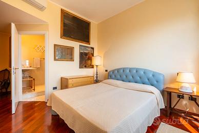 La zona notte ospita due ampie suite, entrambe dotate di bagno privato. I tre bagni dell'immobile sono rifiniti in pregiata cera sarda nei toni bianco-azzurri, con sanitari sospesi e lavabi in marmo bianco. La distribuzione attuale permette, con una semplice modifica, di ricavare una terza camera da letto mantenendo un'alta qualità abitativa.