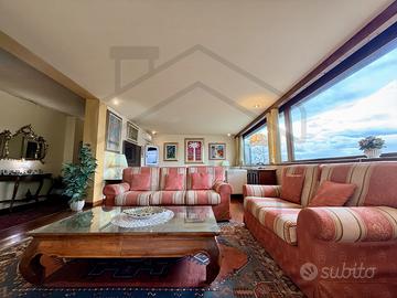L'ingresso conduce ad una zona giorno estremamente luminosa e scenografica: il salone, leggermente rialzato e caratterizzato da ampie vetrate, offre un impatto visivo straordinario e si fonde in continuità con la sala da pranzo, creando un ambiente sofisticato e accogliente.