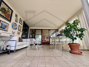 Dal salone si accede alla veranda bioclimatica e al grande terrazzo, le quali permettono di godere dello spazio esterno in qualsiasi stagione dell'anno.