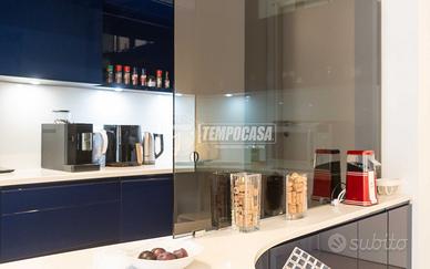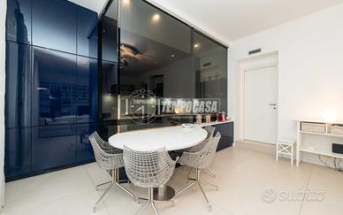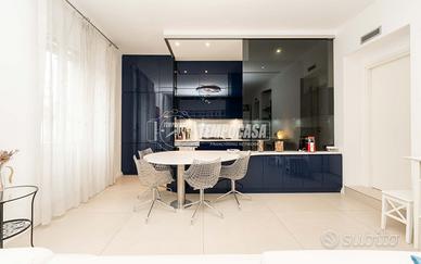 L'ingresso conduce a un comodo disimpegno che apre su un ampio e luminoso soggiorno con cucina a vista, raffinata e funzionale, elegantemente separabile tramite una anta in vetro, soluzione ideale per coniugare convivialità e ordine visivo.