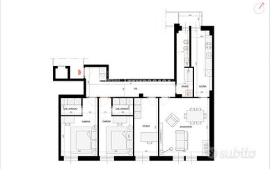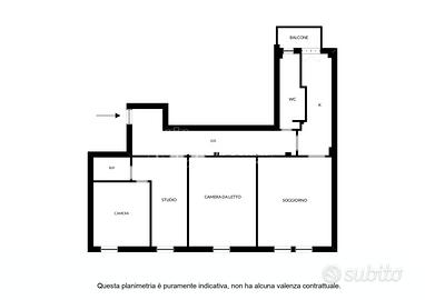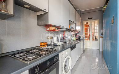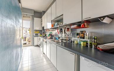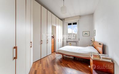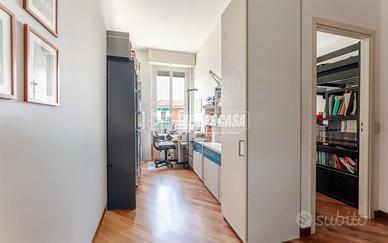 L'ingresso si apre su un comodo disimpegno che distribuisce gli ambienti: una cameretta, uno studio privato e una spaziosa camera matrimoniale. Proseguendo si accede al soggiorno con doppia finestra, ampio e arioso, adiacente alla cucina separata con balcone. Completa la disposizione un bagno finestrato. La pavimentazione è in parquet nella maggior parte dei locali, ad eccezione di cucina e bagno.