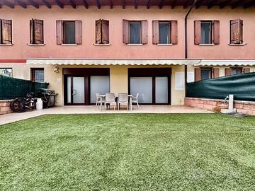 Rif: 2791 (193454511) - Proponiamo in vendita un grande appartamento bilocale di 75 mq commerciali situato nella frazione Esenta di Lonato del Garda, all'interno di un recente e ben curato residence. La posizione è strategica: comoda alla tangenziale per Brescia e Desenzano, a soli 3 minuti dal centro commerciale Il Leone ed a 5 minuti da Desenzano del Garda. L'immobile si trova al piano terra con ingresso indipendente e vanta uno splendido giardino privato dove rilassarsi o ricevere amici nelle belle giornate. Gli spazi esterni sono valorizzati da una zona pranzo pavimentata coperta da tenda elettrica nuova, ideale per pranzi all'aperto o momenti conviviali. Internamente l'appartamento offre ambienti moderni completamente arredati con mobili nuovi, ampia zona giorno open space luminosa grazie alle grandi porte finestre che affacciano sul patio/giardino, cucina moderna attrezzata ed elettrodomestici inclusi. Zona notte composta da camera matrimoniale spaziosa e bagno finestrato ristrutturato recentemente. Classe energetica B garantita dall'aggiornamento impiantistico recente: termoautonomo con climatizzatore caldo/freddo installato nel 2023, cappotto termico esterno per il massimo comfort tutto l'anno. Completano la proprietà garage singolo ampio collegabile direttamente dalla residenza, cantina privata perfetta come deposito bici/moto/cantina vini e posto auto riservato interno alla corte condominiale. Spese condominiali contenute (€75 mensili). Soluzione ideale sia come abitazione principale sia come investimento data la vicinanza ai principali servizi della zona tra cui scuole primarie/secondarie raggiungibili comodamente anche in bicicletta; supermercati/palestre/farmacia sotto casa; fermate autobus verso Lago di Garda/Brescia facilmente accessibili. Non lasciarti sfuggire questa opportunità unica! Contatta subito la nostra agenzia al per m - Classe: B - IPE: 175.00 kWh/mq anno